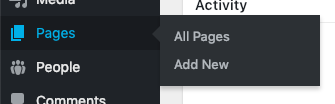 The “Pages” user interface is similar to the “Posts” page in that you are able to view, import, export, and manage all of the pages on your website. To create a new page, click “Add New” at the top of the screen.